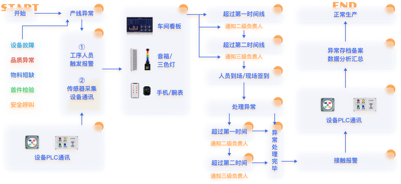 设备可直连我司的智能工业互联灯,配合我司的工业互联网平台,可实现设备状态的自动切换和记录,设备异常时自动触发安灯呼叫,从而实现整个异常过程的自动化闭环管理,提高了记录的准确性和及时性